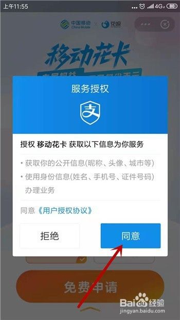 打点移动花卡需要支付宝的授权,点击【赞成】。