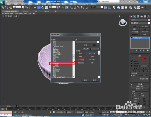 点击【设置装备摆设点窜器集】,弹出设置装备摆设点窜器集选择栏,找到【网格光滑】并将其拉动至右边的选项框中,点击【确定】将【网格光滑】调出到工作区(如图所示);