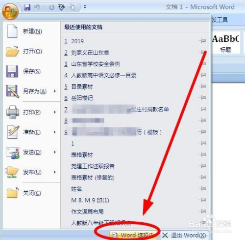 在弹出功能表中,找到右下角最下边一行的“Word选项”点击