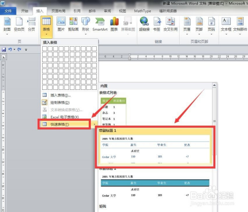 第四种方式。仍是在【插入表格】的对话框中,此次点击最下方的【快速表格】,然后选择所需要的表格形式,例如这里选择“带副题目1”,成果如下图。