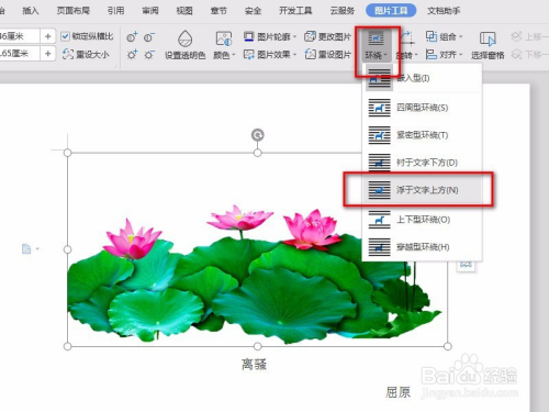 在“图片东西”中找到如图设置图片的位置处,选择“浮于文字上方”点击。