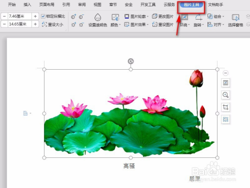 选中图片,点击菜单上方的“图片东西”。