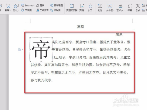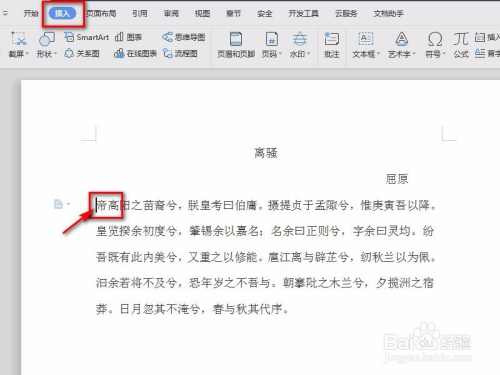 然后,如图将鼠标放在要设置首字下沉的位置,点击“插入”。