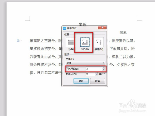 在“首字下沉”菜单元置处设置为“下沉”,下沉行数设置为3行后点击确定。