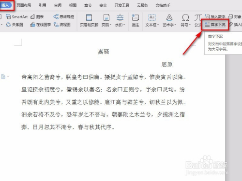 在“插入”菜单处点击“首字下沉”进入。