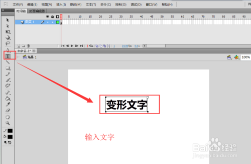选择flash东西栏中的文本东西,在舞台上单击鼠标呈现明灭的光标,然后进行文字的输入。