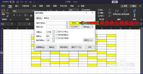 因为我们要查找的内容是“黄色单位格”,说白了它只是一个格局,并不是什么具体的内容。那怎么让弹窗中的查找内容指定为“黄色单位格”呢?其实很简单,我们点击“查找内容”右侧“格局”按钮的下三角符号,并在扩展项中选择“从单位格选择格局”选项,这时我们就可以经由过程选定笔直接选择黄色单位格。如图所示: