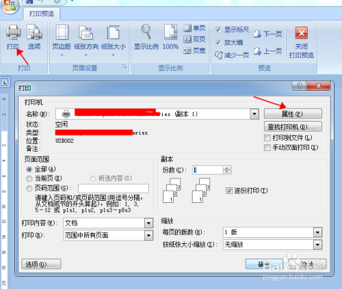 首先,我们点击左上角打印图标,弹出打印机设置界面,点击属性