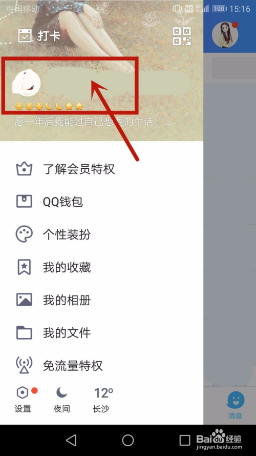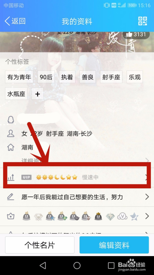 进入“我的资料”界面,找到如图所示有太阳、月亮、星星标记的位置,点击进入。