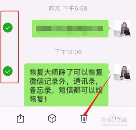 选择性删除:除了全数删除,我们还可以“选择性遗忘”,具体方式:打开与该对友的天界面,长按你想删除或是不想被别人看到的信息,点击页面下方的垃圾桶图标直接删除就ok了。(ps:长按一条信息后,其它想删除的信息只需在圆圈里打勾就行了。