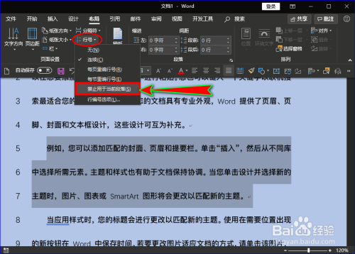 紧接着我们再次单击“行号”选项,在扩展项中点击“禁止用于当前段落”,这时会发现选中的段落没有“行号”了。如图所示: