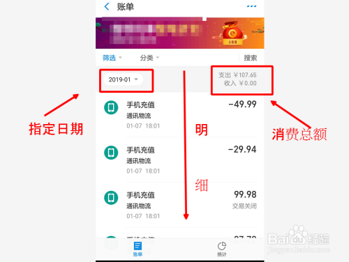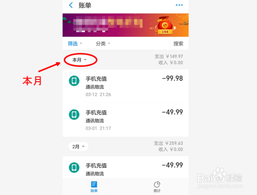 点击确定后,会出来这个分类下的本月账单,若是我们要看指定的月份,点击本月字样调全日期即可。