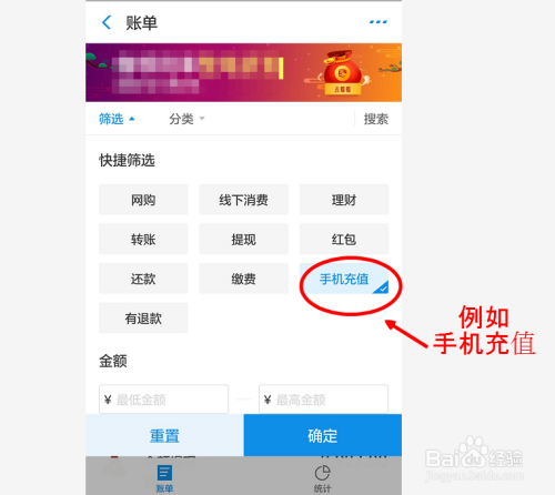 睁开筛选菜单后,我们可以看见里面有一些常用的项目可供选择,好比我们要看给手机充值的部门,点击手机充值。