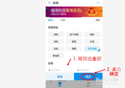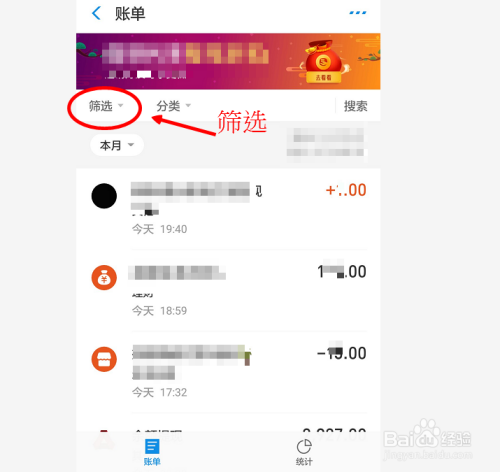 在账单中点击筛选,这个功能就是为了让我们更精确的去查找某一事项的破费。