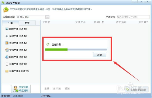 接下来要选择所丢掉文件的驱动盘,例如这里选择E盘“进修(E:)”。选择好了之后,点击【起头扫描】,随后会呈现正在扫描进度条。