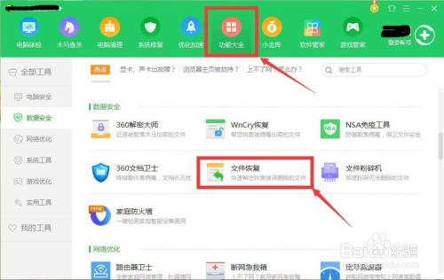 首先打开软件。在上方导航栏里选择【功能大全】,随后鄙人拉页面里面找到并点击【文件恢复】。