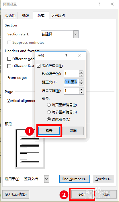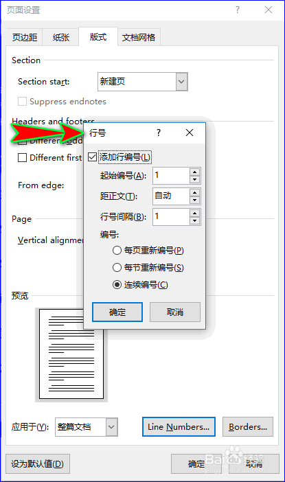 接着我们在“页面设置”弹窗的“版式”界面中单击“Line Numbers(行号)”选项,这时又会弹出“行号”对话窗,如图所示: