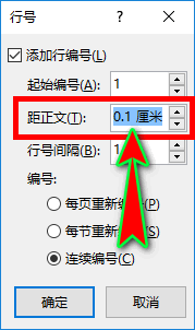 因为我们是要缩短行号与正文之间的距离,故我们可以在“主动”处直接输入数字或点击“主动”处标的目的上的三角符号,这时“主动”处呈现的数字就是行号与正文之间的距离。如图所示: