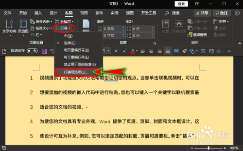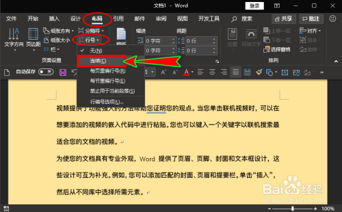 打开word文档,我们点击“结构”本家儿菜单中,鄙人面的子项中单击“行号”选项,并在扩展框中选择“持续”,这时我们的文档就添加了行号。如图所示: