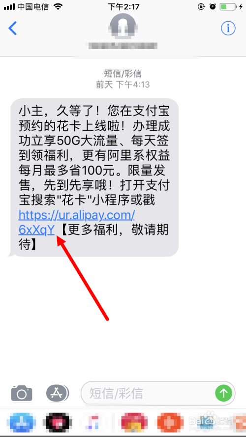 首先在手机上打开收到的那条花卡上线的短信,点击上面的链接。