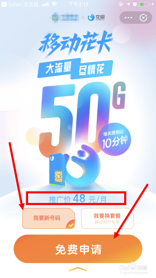 系统会主动跳转到支付宝移动花卡申请的页面,首先选摘要新号码仍是改换套餐,若是没有移动号码那就必需得申请新号码。小编选择 要新号码 ,点击 免费申请 。