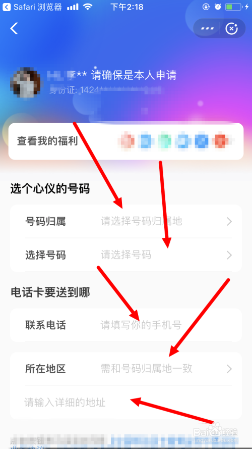 鄙人一个页面,需要填入 号码归属 ,再选择一个 心仪的号码 ,还要填入本身的收货地址以及联系德律风。