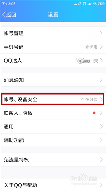 我们需要在设置功能里点击打开【账号、设备平安】设置。