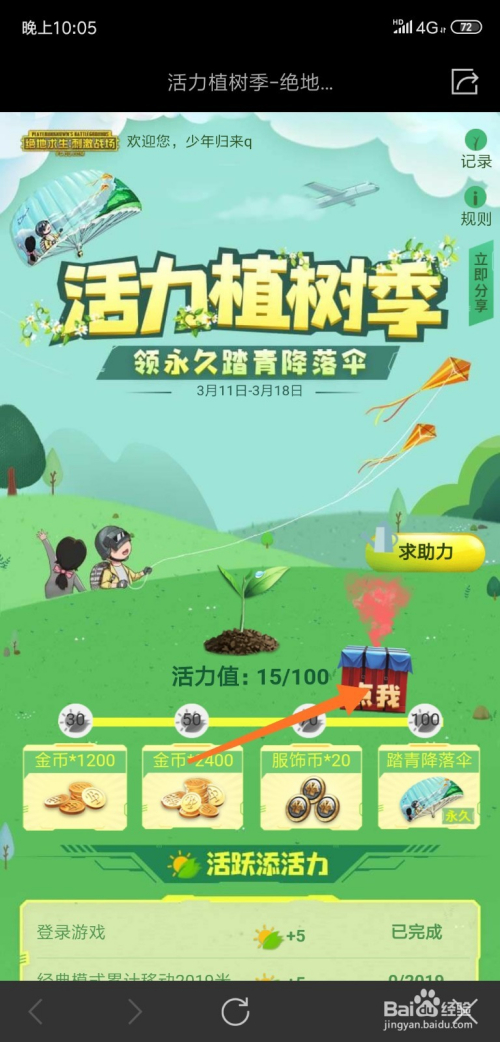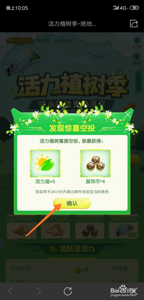 进入踏青下降伞图标之后,我们就已经进入了宣传页面。我们点击图中的空投盒子即可。点击空投盒子之后,我们可以获得5活力值和服饰币4个,如下图所示。
