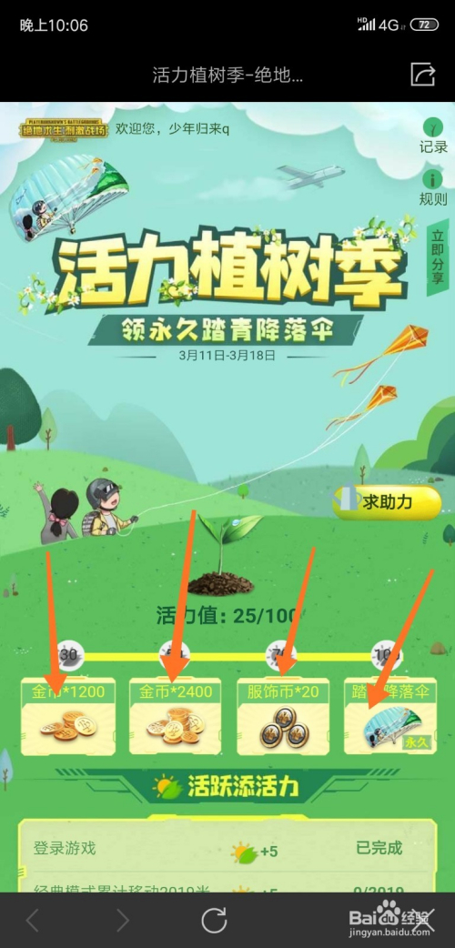 我们在获得30点活力时可以获得金币1200,50活力时可以获得金币2400,70活力时可以获得服饰币20,而满100活力值机后即可获得踏青下降伞。如下图所示。