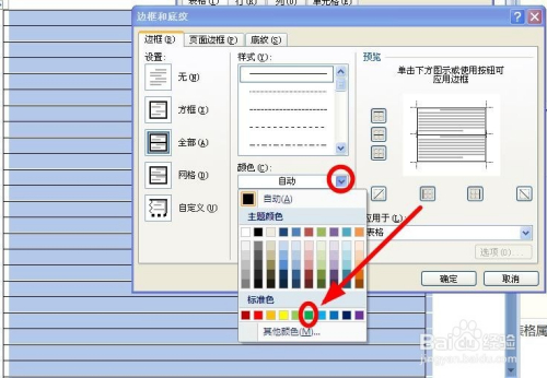 在“边框”选项卡,找到“颜色”后面的下拉箭头。选中“绿色”单击,在单击“确定”