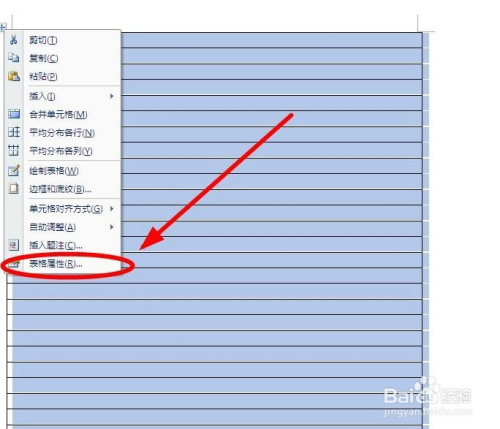 全选表格后,利用鼠标右键,单击右键菜单中的额“表格属性”