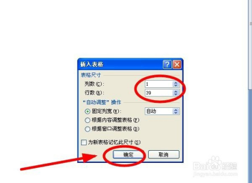 在“插入表格”对话框,设置表格为“1列39行”后,单击“确定”