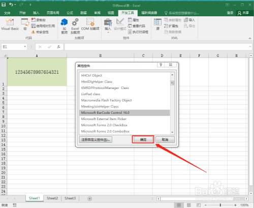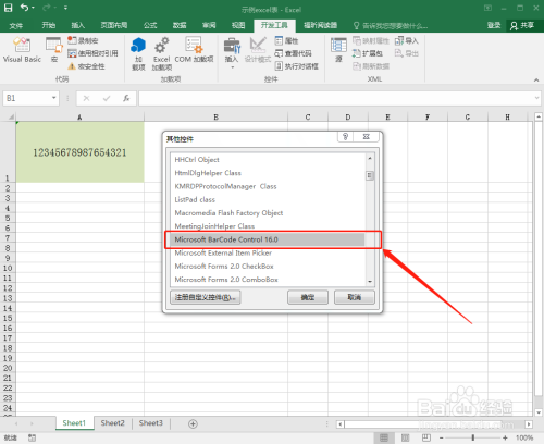 在“其他控件”下拉列表中,单击选择“Microsoft BarCode Control 16.0”控件,然后单击右下角“确定”按钮。