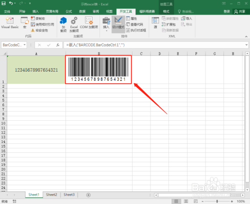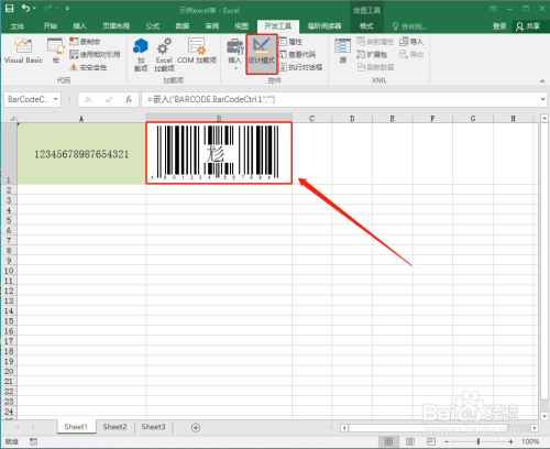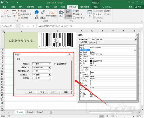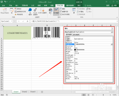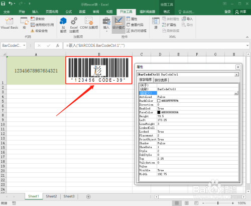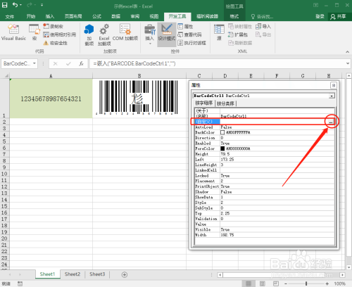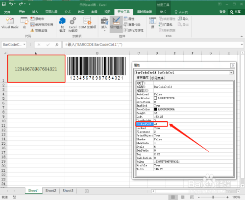 此时可见,设计模式的条形码已经发生了一些转变,但仍然要进行关头性的一步,在“属性”表单“LinkedCell”右侧区域输入条形码需要联系关系的单位格,本示例中为“A1”。回车,这个时辰最终版的条形码就已经建造当作功了!