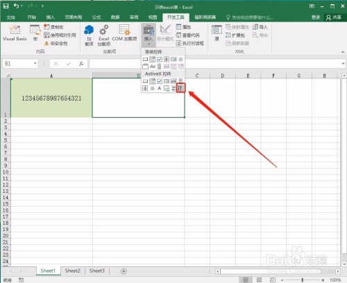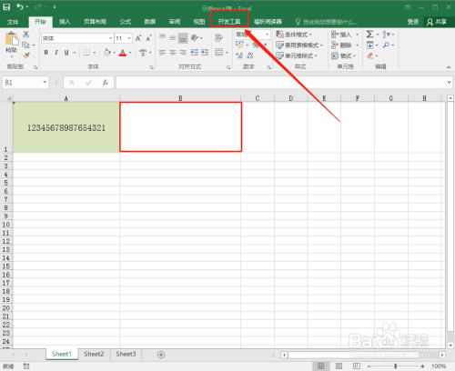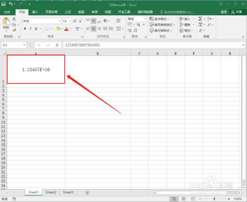 在单位格中输入您要生当作条形码的数字信息,Excel默认对跨越11位字符长度的数值以科学计数法暗示,例如输入“12345678987654321”则显示为如图所示。