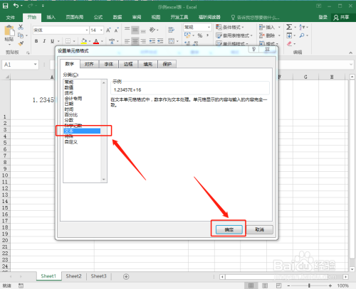 在“数字”选项卡中,单击“文本”,然后单击右下角“确定”按钮。