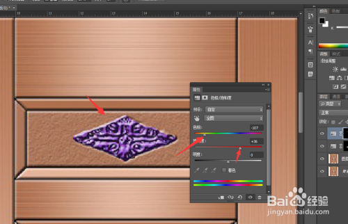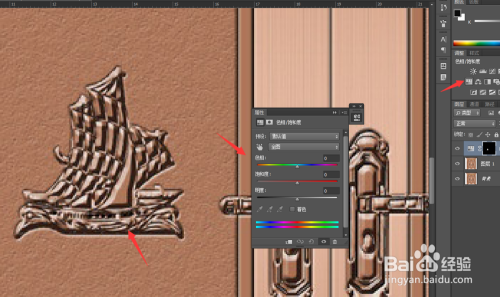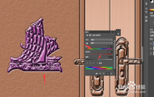 将浮雕勾选出来之后,我们选择色相和饱和度东西,将勾选出来的区域,色相偏蓝,然后饱和度继续增添,可以看到我们整个浮雕的颜色就变了,如下图所示。