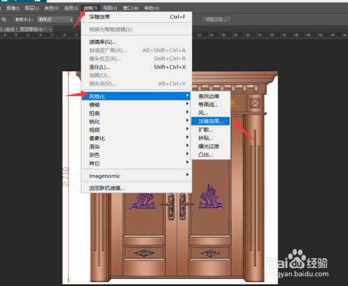 最后我们利用滤镜,气概化,浮雕结果。将整个门做出浮雕的结果,我们设置的角度为92度,高度为33像素,然后点击确定即可,如下图所示。
