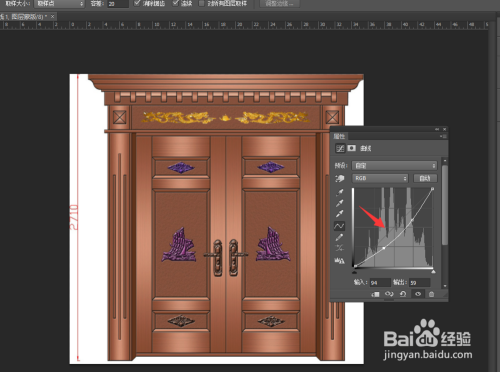 接着我们是利用魔棒东西将空白区域勾选出来,然后选择反标的目的,将整个门的区域给抠出来之后。我们利用曲线东西,将整个门的色调调暗,这样更具有铜色的结果,如下图所示。