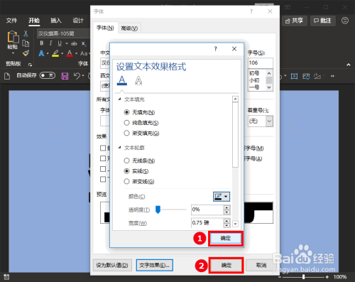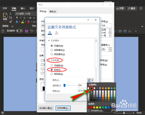 文本填充参数设置后,我们再单击“文本轮廓”选项,在其子项中选择“实线”,且将线条的颜色选择“黑色”。如图所示: