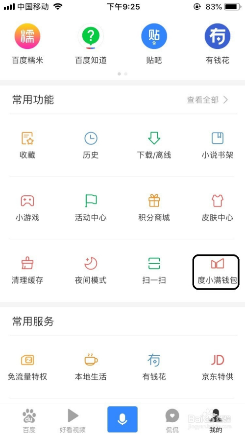 打开百度的“我的”选项界面中找到度小满钱包的进口并打开它。