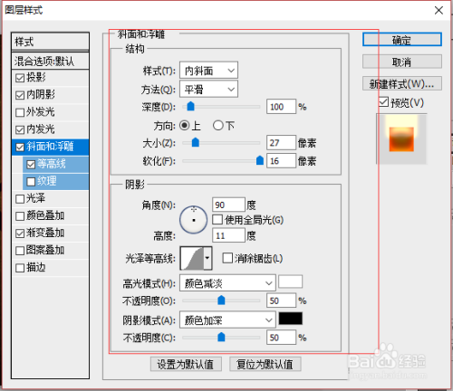 接下来是最为主要的,双击文字图层,设置相关参数,首先设置斜面和浮雕,相关参数如下。