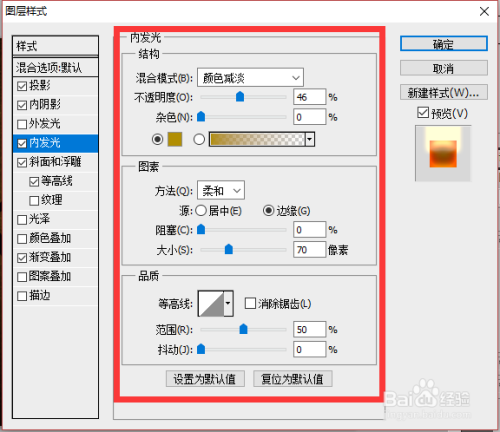 再来我们设置内发光,相关参数如下图所示,我们也可以按照本身的审美调整参数。