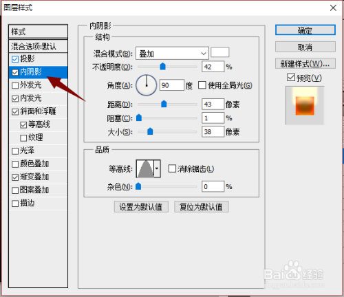 接下来是内暗影的设置,夹杂模式叠加,不透明度42等等参数。