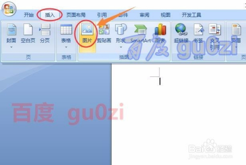 特意利用旧版原本演示,这是2007版本的Office,在word中新建一个文档,然后从 插入标签页面中,选择 图片,