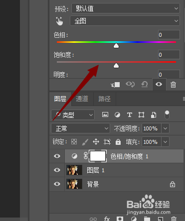 接下来我们添加色相饱和度调整图层,而且将饱和度拉倒最低。