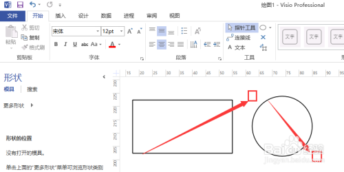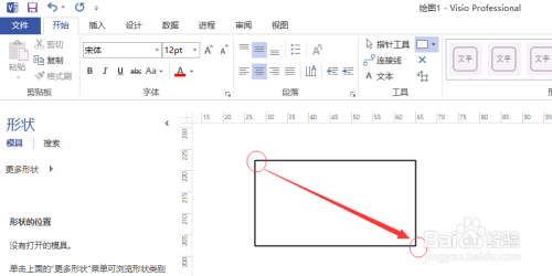 在外形板块中依次点击更多外形、流程图和箭头外形。然后鼠标左击响应的箭头进行拖动到显示区域即可画出箭头,移动箭头响应的约束点即可调整其大小,如图所示。