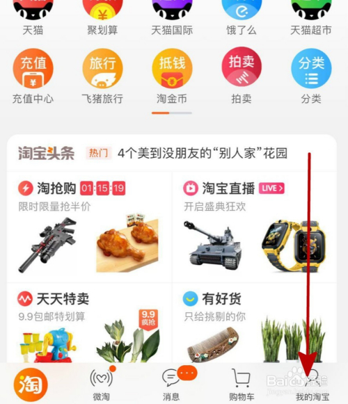 在打开的淘宝页面中点击下方东西栏中“我的淘宝”,如下图