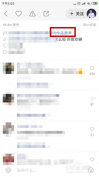 然后在评论区的上部能看到作品原声,点击这个选项,如图所示。