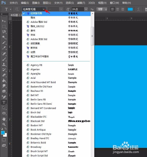 第三步:在字体下拉菜单中选择所需的字体,并设置好字号,在画布中输入文字。